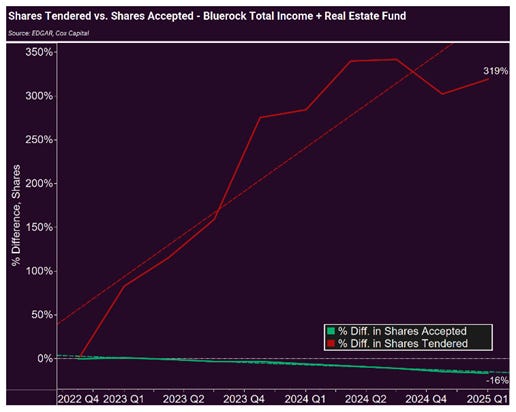 Since Q4 2022, total shares redeemed have increased 320% and shares accepted have dropped 16%. With requests and acceptances headed in opposite directions, the queue is unlikely to clear naturally, at least not anytime soon.