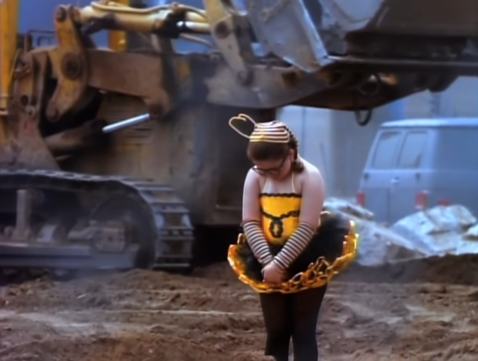 The video opens with a girl in a bumblebee costume performing a silly dance, for which she is immediately laughed at. She cries, runs off stage, and proceeds to wander around the city performing her bumblebee dance for people who just don’t get it.